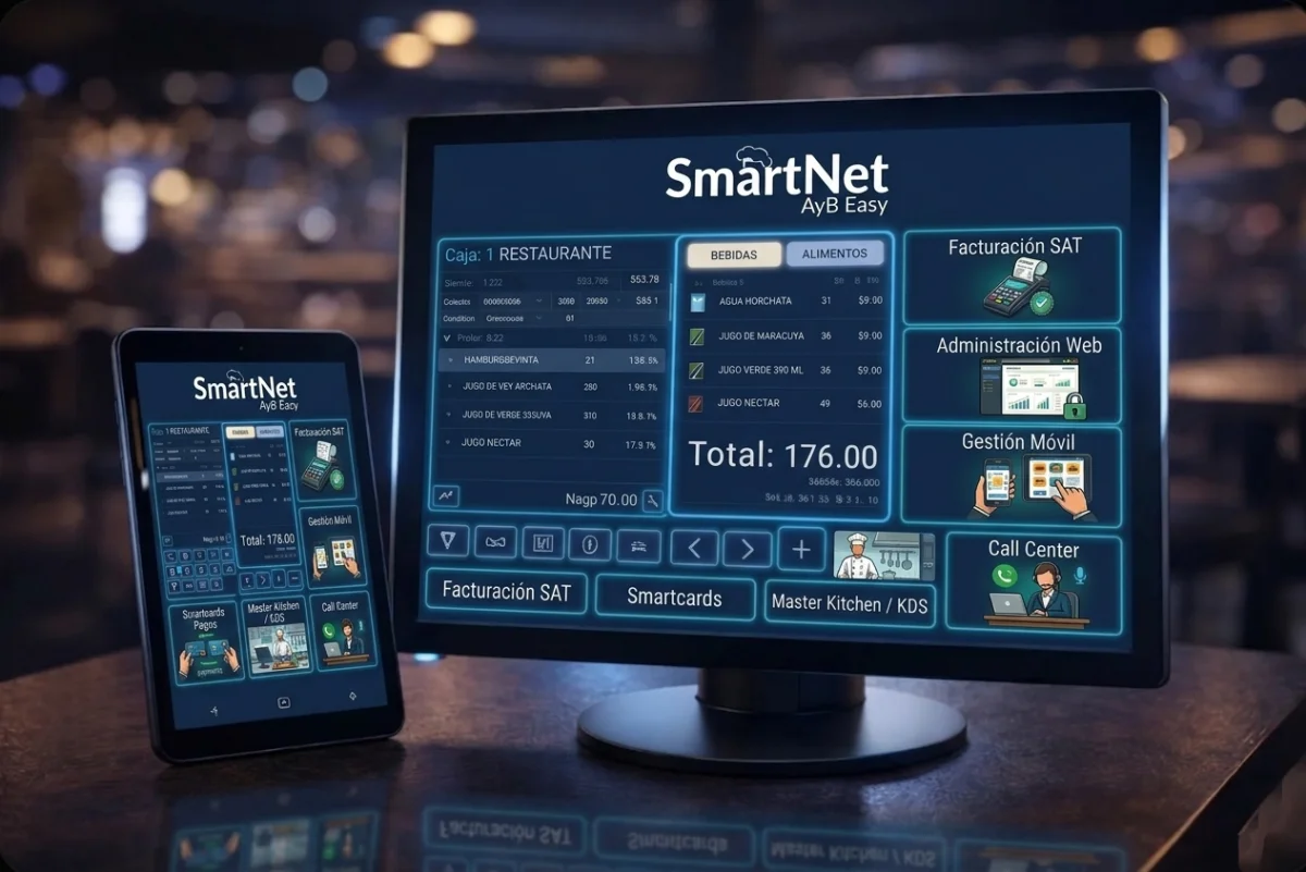 SmartNet AyB Easy es un sistema integral diseñado para transformar la operación de restaurantes, bares y negocios del sector alimentos y bebidas. Centraliza ventas, inventarios, costos y producción en una sola plataforma, permitiéndote tener control total de tu negocio en tiempo real.